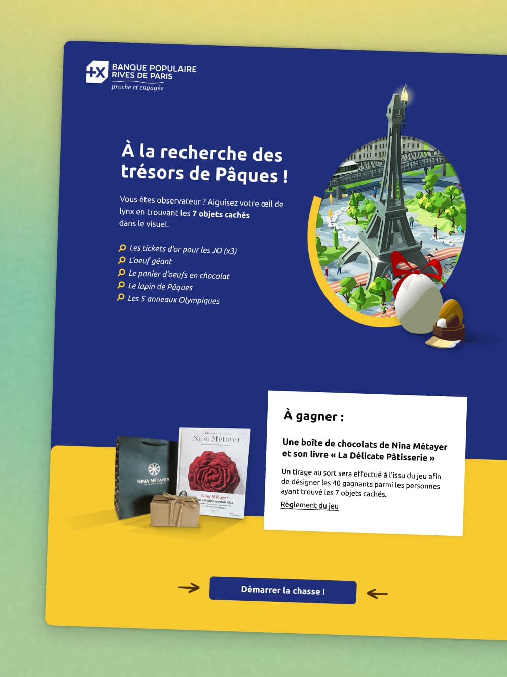 La Banque Populaire Rives de Paris nous a de nouveau missionné afin de réaliser un petit jeu concours interactif basé sur le principe de 'Où est Charlie ?'.